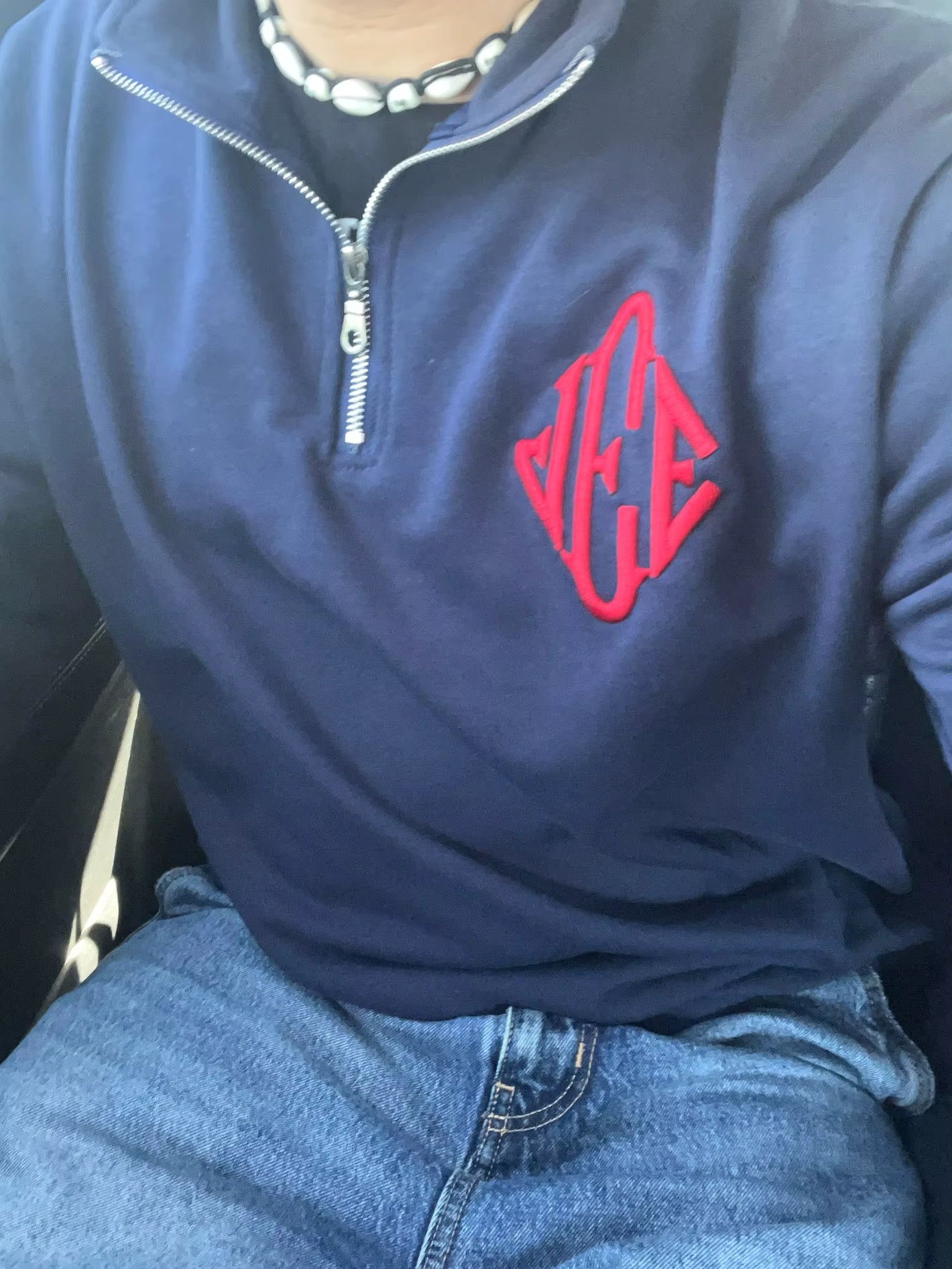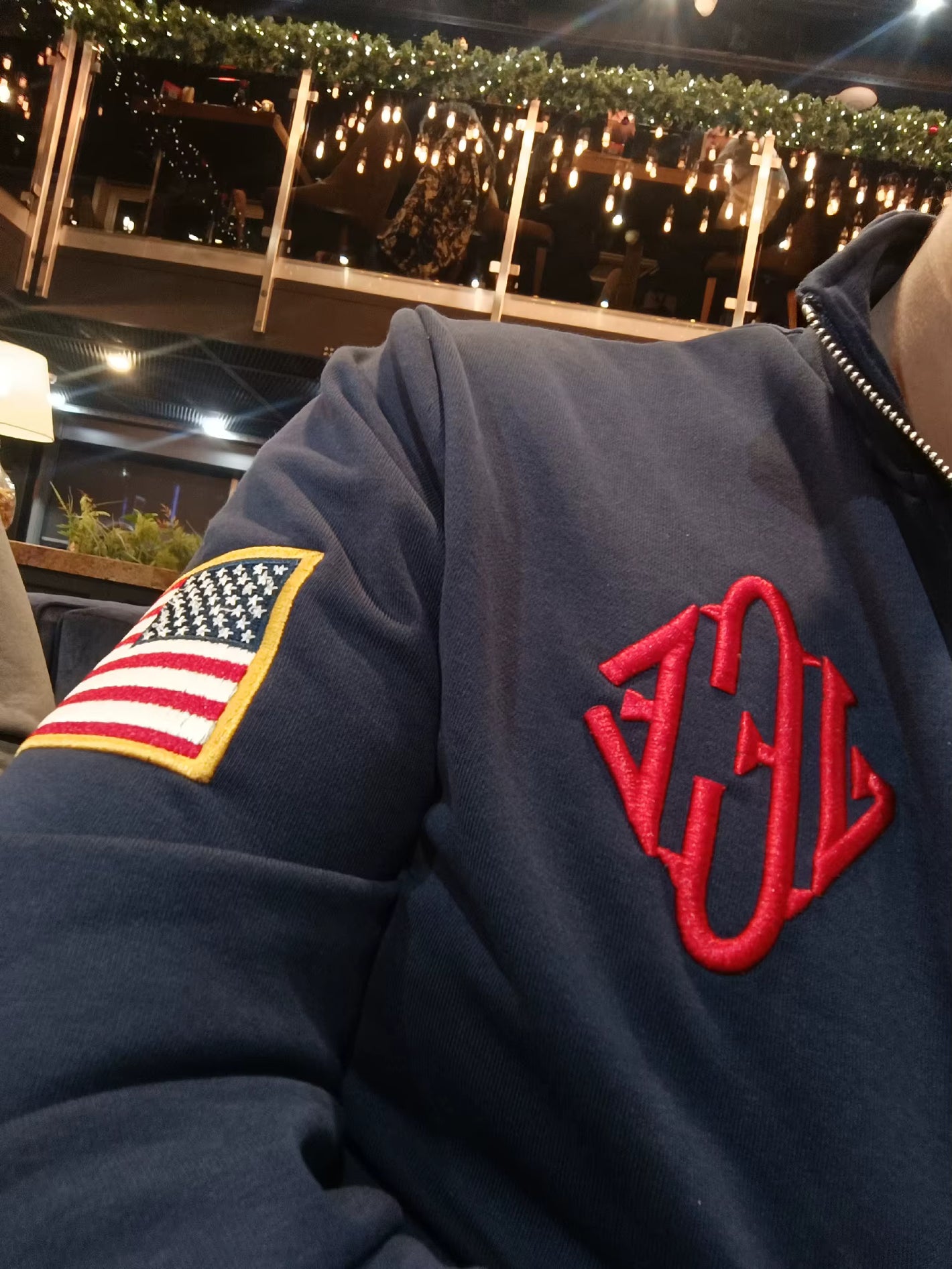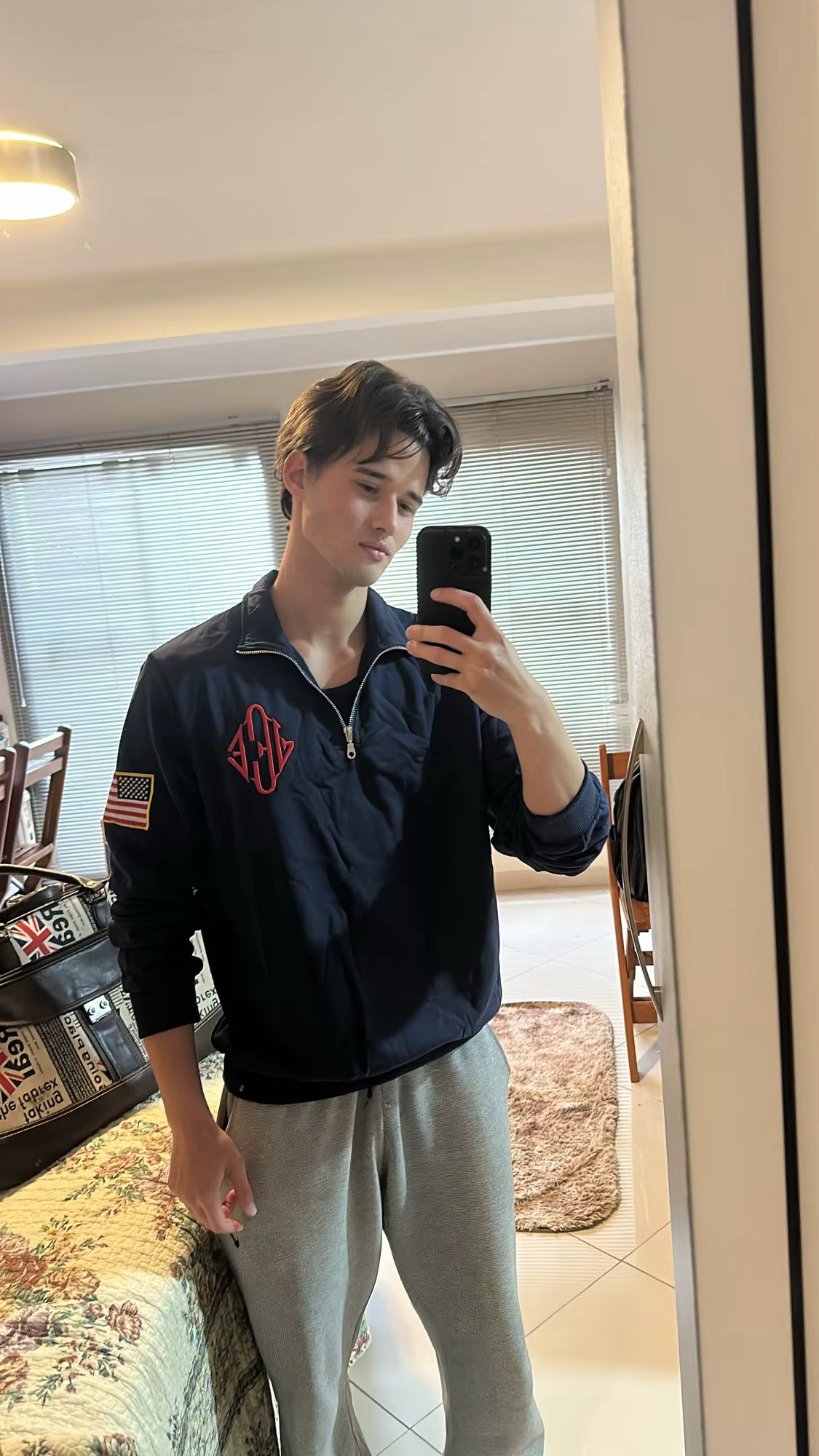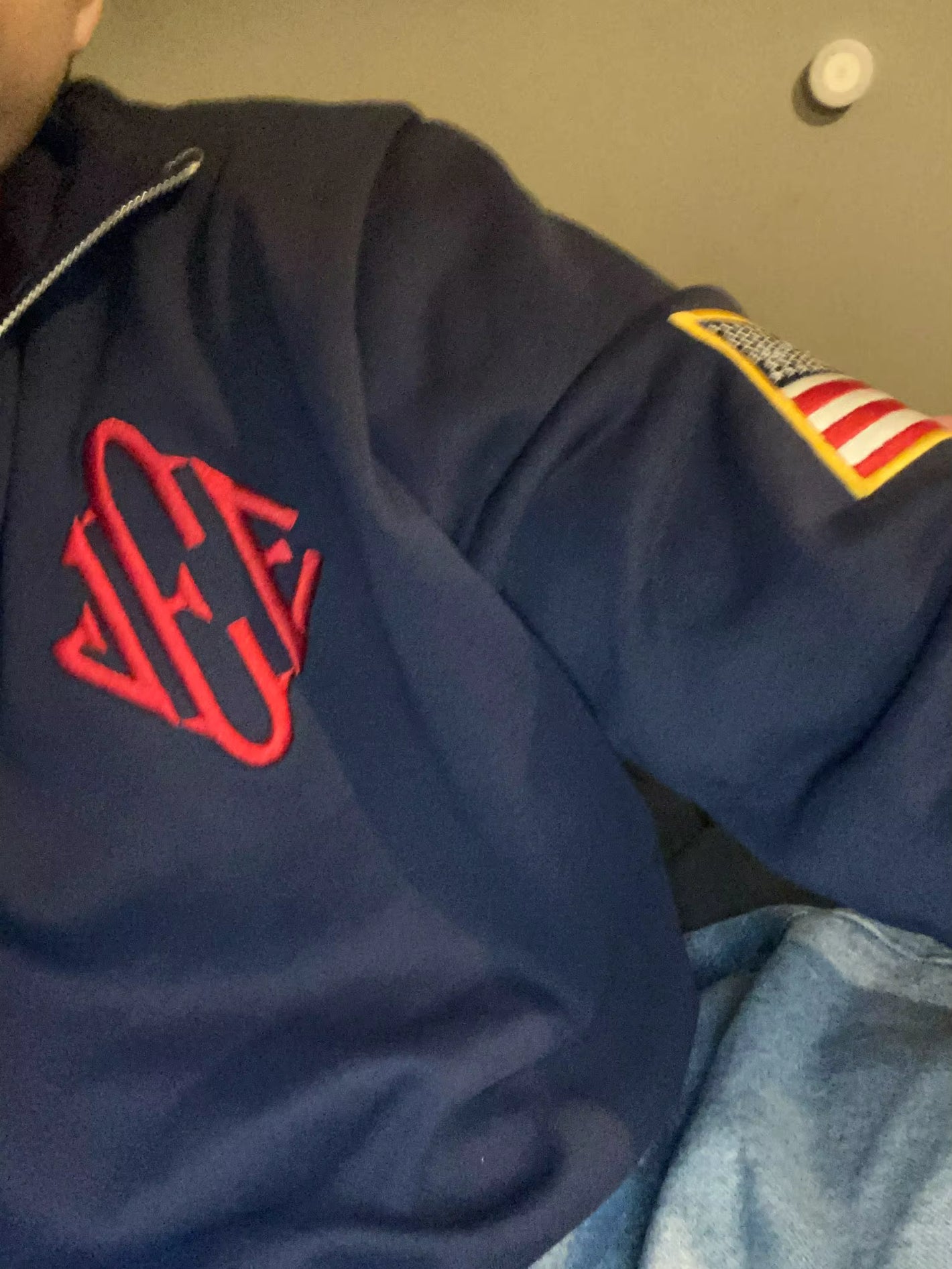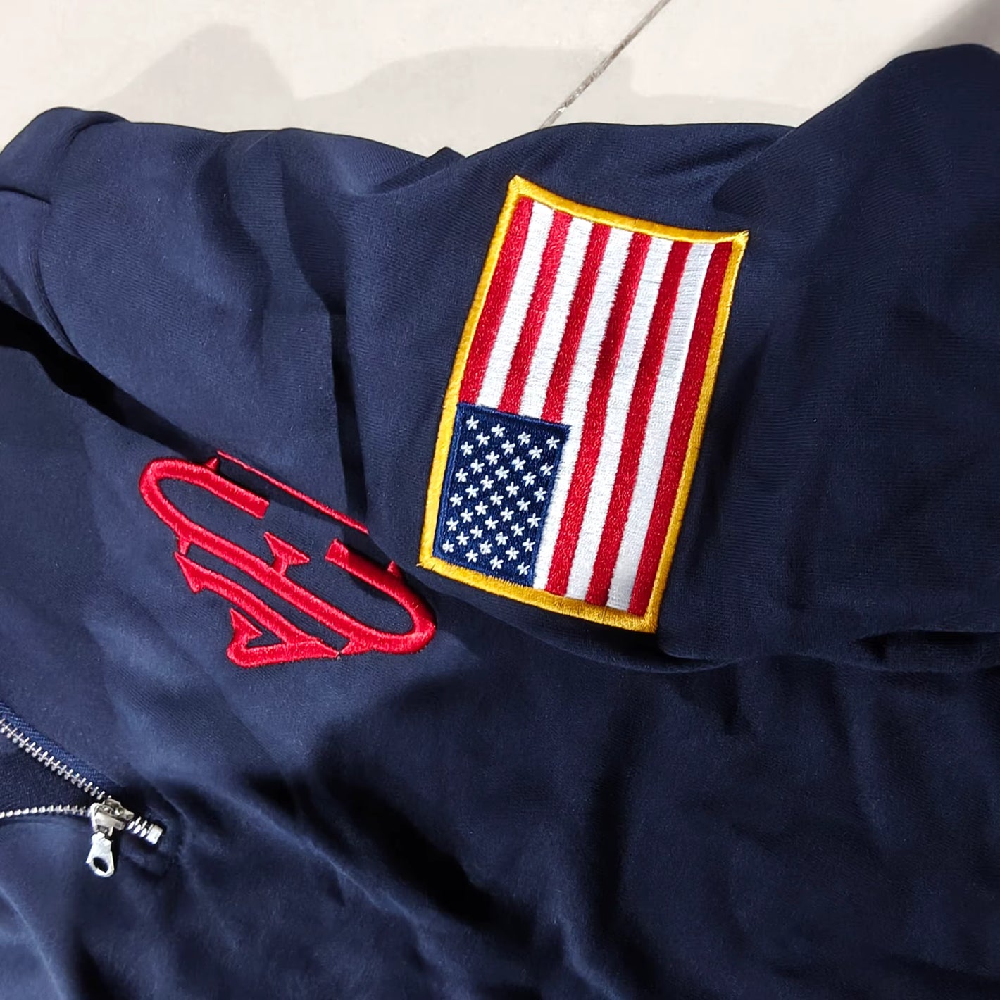 1:1 to the original, dark navy blue, gold zipper, and embossed embroidery