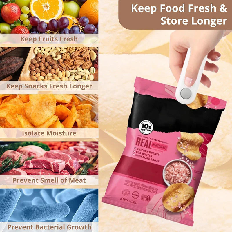 check_circle Works on Real-Life Snack Bags: From chip bags to veggie packs and pet treats, it seals the bags you actually use every day.